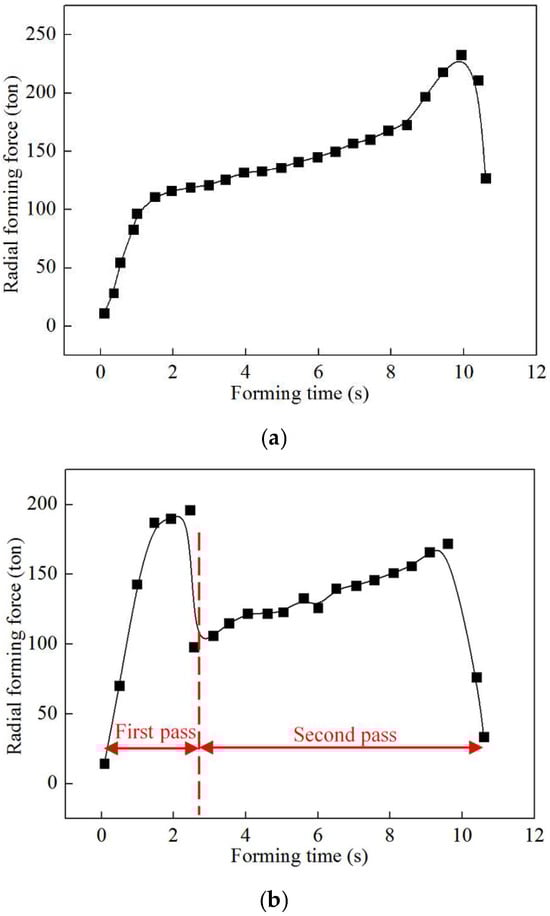 As shown in Figure 12a, during double-pass CRR of TWCCTRR, the radial forming force of the mandrel shows a significant increase in the stage of the first-pass CRR, while the radial forming force firstly quickly increases and then quickly decreases in the stage of the second-pass CRR, which is mainly induced by the variation of the contact area between the mandrel and skin. Notably, in the transition stage between the first-pass CRR and second-pass CRR, there is a sharp decrement in the radial forming force. This is because the number of divided-flow planes changes from 1 to 2 in this stage, resulting in a sharp decrease in average normal stress in the loading area of the skin, as displayed in Figure 11. For the above cause, the radial forming force of the mandrel presents a sharp decrement trend in the transition stage between the first-pass CRR and second-pass CRR.