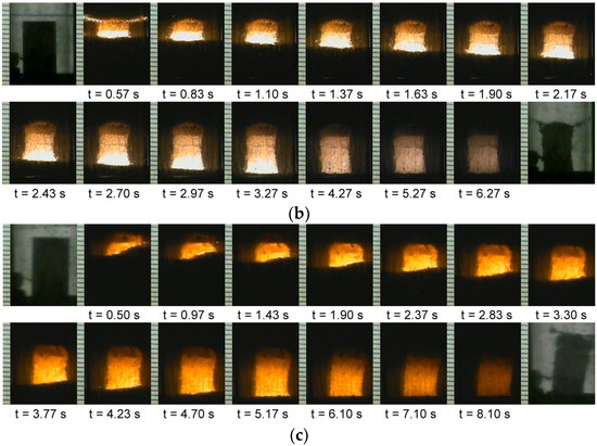 Time sequences of recorded SHS images illustrating the propagation of self-sustaining combustion wave of (a) an elemental sample of Ti:Al:C = 3:1:2, (b) a TiC-added sample of x = 0.3, and (c) a TiH2-added sample of y = 0.3.