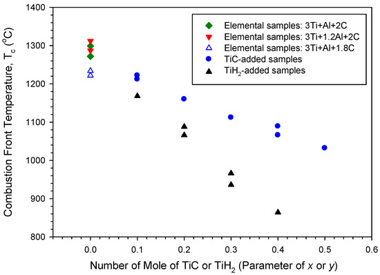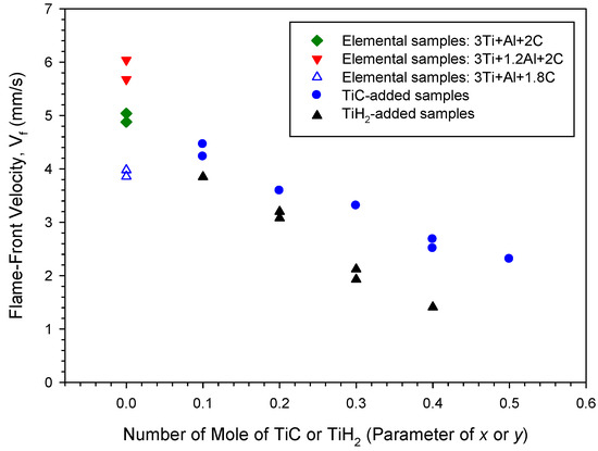 A significant decline in the combustion wave velocity was observed in the TiC- and TiH2-added samples. Figure 2 shows the decrease in flame-front velocity from 4.5 to 2.3 mm/s as the TiC content increases from x = 0.1 to 0.5, beyond which combustion ceases to propagate and is quenched. This was caused by the dilution effect of TiC on combustion. When the reaction exothermicity was no longer sufficient to maintain the combustion process in a self-propagating mode, the burning was extinguished. As indicated in Figure 2, the decline in combustion velocity was more pronounced for the TiH2-added samples, and the flame-front velocity was lowered from 3.9 mm/s at y = 0.1 to 1.4 mm/s at y = 0.4, and, further than that, combustion failed to be initiated. Because the decomposition of TiH2 to produce Ti is a highly endothermic process with ΔH = 144.4 kJ/mol [43] and the conversion took place at temperatures above 700 °C [32], this made the TiH2-added samples less energetic. Moreover, H2 gas formed from the decomposition of TiH2 and the release of gaseous hydrogen from the porous powder compact could cause additional heat loss. This explains the substantial decrease in combustion velocity and limited range of combustibility observed in this study for the TiH2-added samples. It should be noted that one or two experiments were conducted for each sample in this study. When two specimens were synthesized, two experimental points were reported for one type of sample. Repeated experiments were performed to verify the reproducibility of the measured data.