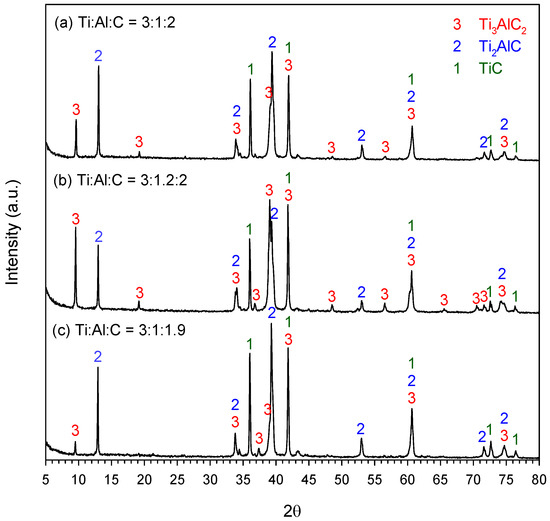 XRD patterns of the synthesized products from elemental powder compacts with starting compositions of (a) Ti:Al:C = 3:1:2, (b) Ti:Al:C = 3:1.2:2, and (c) Ti:Al:C = 3:1:1.9.