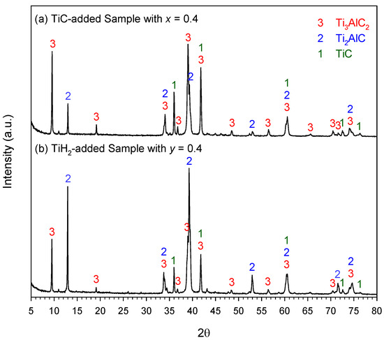 XRD patterns of the synthesized products from (a) TiC-added sample with x = 0.4 and (b) TiH2-added sample with y = 0.4.