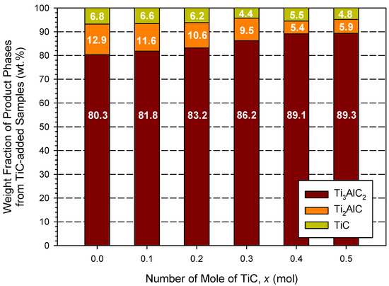 Weight fractions of Ti3AlC2, Ti2AlC, and TiC in synthesized products from TiC-added samples of Equation (2).