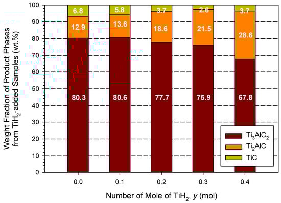 Weight fractions of Ti3AlC2, Ti2AlC, and TiC in synthesized products from TiH2-added samples of Equation (3).