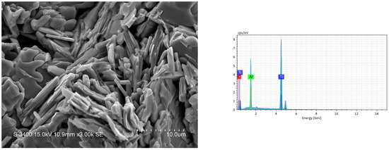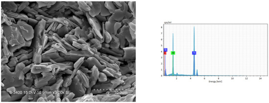 SEM image and EDS spectrum of a synthesized product from TiH2-added sample of Equation (3) with y = 0.3.