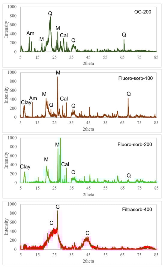 XRD spectra of the sorbents used in the study are demonstrated in Figure 1. OC-200 exhibited characteristic peaks of montmorillonite at 2θ values of 19.5° and 26.4°, along with strong quartz peaks at 20.2°, 36.2°, and 66.06° and a distinct calcite peak at 29.4° [32]. Additionally, the peak at 10.1° suggests the presence of quaternary ammonium salt [33]. Quaternary ammonium salts are used in the synthesis of organoclays. Hence, their XRD signatures are expected in OC-200. Fluoro-sorb-100 and -200 exhibited similar XRD patterns, with a prominent peak at 7.19°, corresponding to the basal spacing of the clay layers [34]. Additionally, the presence of characteristic quartz peaks was noted, which could be because of impurity. Filtrasorb-400 exhibited two broad peaks at 24° and 43.5°, characteristic of the amorphous structure of activated carbon, and the presence of a small but sharp peak at 26.55°, suggesting traces of graphite crystals [35,36].