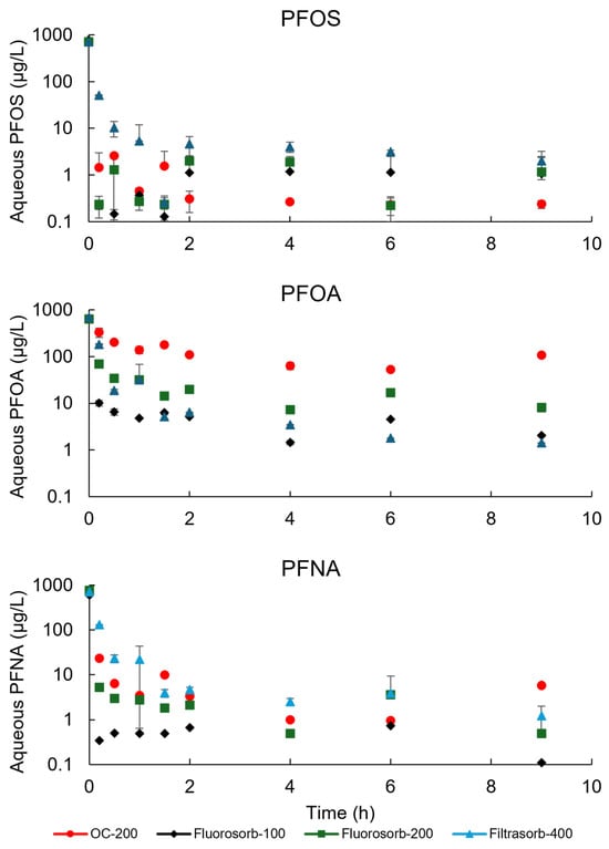 Kinetics of PFNA, PFOS, and PFOA adsorption on sorbents. Y-axis is on logarithmic scale.