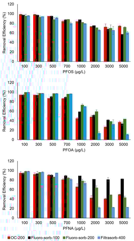 Removal efficiency for each PFAS–sorbent pair was estimated by employing Equation (1).