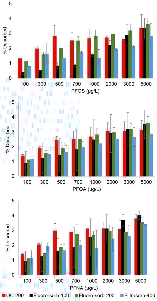 The desorption profiles of PFOA, PFOS, and PFNA for various sorbents were evaluated under controlled conditions (pH 6.8 ± 0.2) across the initial concentration range of 100–5000 µg/L (Figure 5). Notably, the desorbed fractions of PFOS and PFNA remained below 10% of the total adsorbed mass for most sorbent materials across all initial concentrations. PFOA desorption was generally lower, with values typically under 5% for all sorbents. Filtrasorb-400 and Flouro-sorb-200 demonstrated superior performance by consistently exhibiting the lowest desorption fractions for all three PFAS compounds across the entire PFAS concentration range. Low desorption fractions of the PFAS compounds denote that sorption is largely irreversible and, hence, possibly dominated by inner-sphere complexation [37]. Low desorption extent further highlights the suitability of all these commercial sorbents for in situ field application, such as in the PRBs for groundwater remediation.