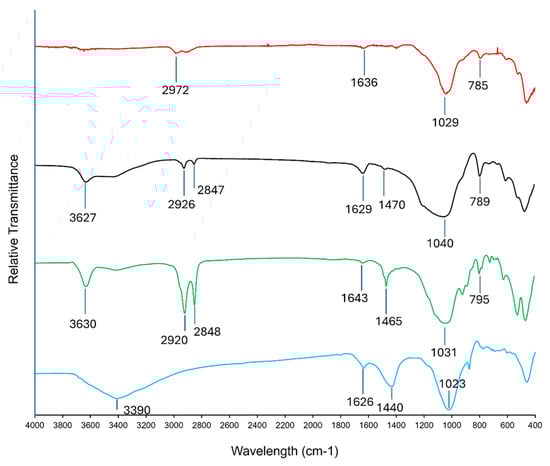 The sorbent materials were characterized using FTIR spectroscopy, in the mid-IR region (400–4000 cm−1). Several characteristic vibrational regions pertaining to functional groups that may play a crucial role in the adsorption processes of PFAS compounds could be identified using FTIR spectroscopy.