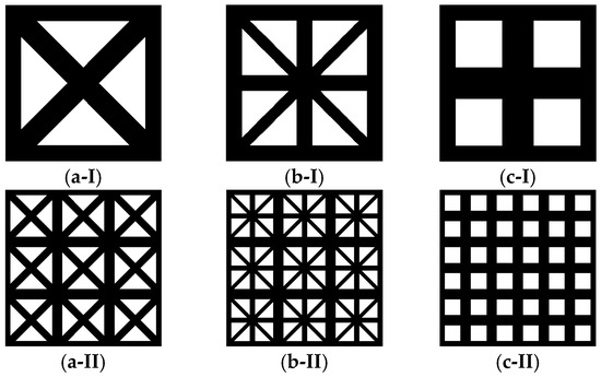 A lattice material model is constructed based on the parameterization approach proposed by Wang [46]. The microstructural RVE is set to a size of 1 × 1. By controlling the material volume in the RVE, the material volume fraction is maintained at 64% within the square frame. The width parameters of the horizontal and vertical rods in the center, denoted as x, are varied within the range of . A series of 2D lattice RVEs was then constructed, as shown in Figure 4.