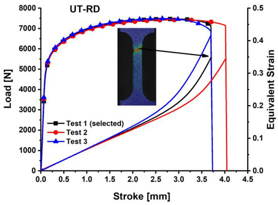 Load–stroke curves of QP980 for the dogbone specimens (UT) along RD.