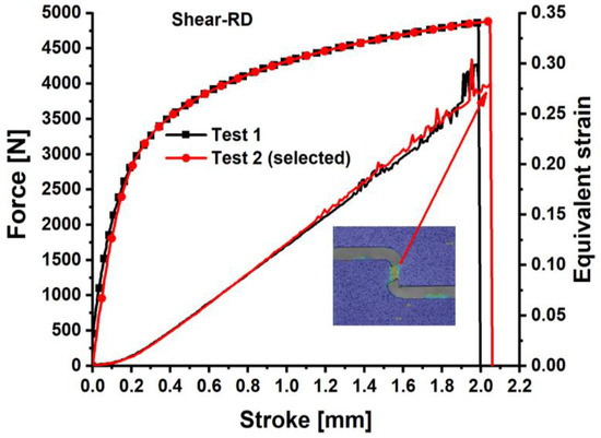 Load–stroke curves of QP980 for the shear specimens along RD.