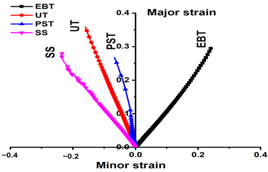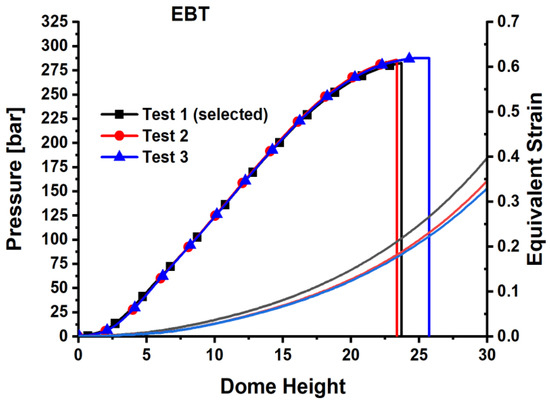 Bulging tests were conducted on QP980 steel. The velocity of the punch was 5 mm/min. To ensure the experiments are replicable, three bulging tests were conducted. Figure 7 illustrates a graph showing the pressure and dome height. The graph illustrates the progression of equivalent strain in proportion to the dome height, with test #1 selected for further analysis. Figure 8 illustrates compressive fracture for strain routes in major–minor strain space for UT, PST, SS, and EBT tests up to the point of fracture. The graphs illustrate the strain limitations prior to fracture, with the X-axis representing minor strain and the Y-axis indicating major strain. The area under the fracture represents the secure formation zone, whereas locations on or above them indicate failure. This graphic enhances forming techniques, guaranteeing that QP980 steel satisfies automotive performance standards.