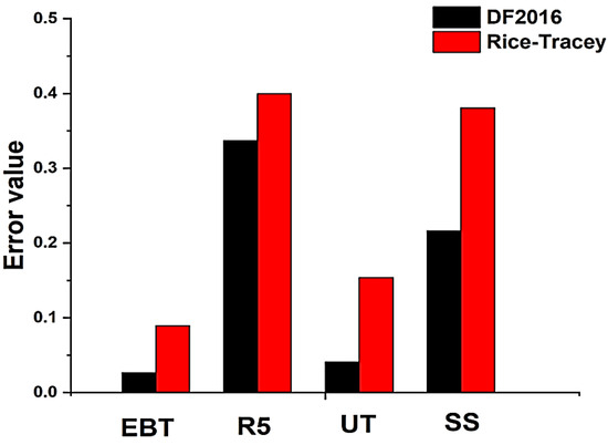 Value of errors under the Rice–Tracey and DF2016 models at various loading conditions.