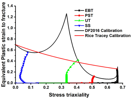 The experimental results are compared to the predictions by using the Rice–Tracey and the DF2016 fracture criteria for analyzing the ductile fracture behavior and the fracture of QP980 steel. Based on the Rice–Tracey criteria, the stress triaxiality is the only factor that impacts the ductile fracture, and it predicts that the fracture strain declines exponentially with the increasing triaxiality. As shown in Figure 12, uniaxial tension and equibiaxial are two cases of fundamental stress states for which the Rice–Tracey criteria effectively fit the experimental fracture data. However, it excludes the Lode parameter, a vital factor to affect fracture behavior in more complicated loading conditions, such as shear and plane strain tension. Consequently, obvious discrepancies between the experiment and a model prediction are observed in the stress states, where triaxiality is apparent and the strain route is complex. The DF2016 criteria significantly enhance the model’s prediction capability under UT, PST, SS, and EBT. They enable the model to correctly capture how these materials fail under complex states of stress. The model correctly identifies the trends of experimental data, particularly at intermediate and high triaxialities, where the Rice–Tracey model shows deviations and the DF2016 criteria may turn out to be very promising in predicting material failure for a broader range of stress conditions. Its reliability in simulating the onset and propagation of fractures is demonstrated by the good agreement of the fracture locations it predicts with experimental results.