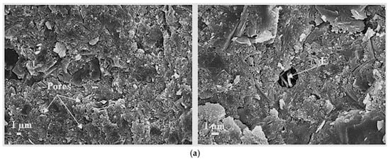 Concrete samples HPC-3 and HPC-6 with MS had the lowest water absorption rates, as their structures had the highest density. Water absorption of the MS-containing samples reduced by about 50%, from 1.32% to 0.71% (Figure 5), compared to the HPC-1. Traditionally, MS has been used to improve workability, packing density, and the performance of concrete by filling voids between cement particles. However, the proposed approach strategically combines the effects of MK and MS, with the aim of a more comprehensive improvement of the concrete microstructure. MK, which is coarser than MS, is introduced to initially fill the voids between the cement particles. The addition of MS helps to fill the voids between MK and cement particles [52,53,54]. HPC-2 samples containing MQ had the highest water absorption rate, which was 6% higher than the absorption of the control sample. SEM images (Figure 4f) revealed numerous voids with diameters of approx. 50–100 µm around the aggregates in these samples.