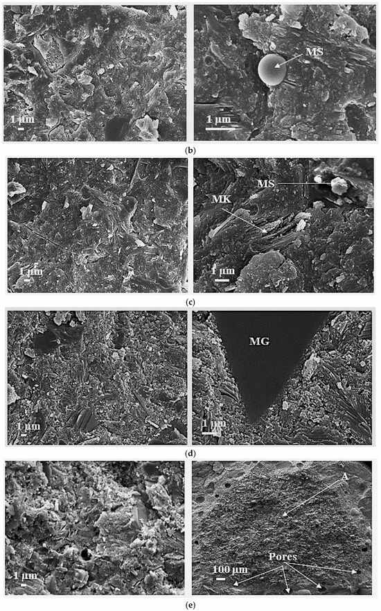 SEM tests (Figure 4) confirmed the formation of a very dense structure in samples HPC-3 and HPC-6 (Figure 4b and Figure 4c, respectively). Samples of HPC-3 have a very dense structure, MS particles with a very smooth surface are uniformly distributed, and they are well bonded with the cement matrix. In HPC-6 concrete, the surface of MS particles is covered with new hydrates, the growth of which is induced by the reactivity of MK, which bonds well and reacts with the cement matrix. The degree of MK particle reaction was higher in the samples where both additives were used together in comparison with sample HPC-4 modified by metakaolin alone (Figure 4f). The structures of control samples of HPC-1 were slightly more porous, with more pores with ettringite visibly distributed across the entire surface area (Figure 4a). The structures of HPC-5 samples containing MG were more porous and, as mentioned in the paper [68], most of the pores formed near the glass particle (Figure 4d). Concrete samples HPC-2 and HPC-4 had very similar compressive strengths, but their microstructures were different. Samples of HPC-2 revealed the formation of rather large (10–50 µm) air voids around the aggregate grains, whereas no such air voids were observed in other samples. No ettringite was observed in these air voids, which was different from the control sample HPC-1. Samples of HPC-4 with MK additive had a more plate-shaped microstructure. As waste MK from expanded glass granule manufacturing was used in this study, numerous fine glass granules with diameters from 100 to 200 µm, mostly with closed porosity, and which were firmly bonded with the cement matrix were observed in concrete HPC-4 (Figure 4f). These granules absorbed part of water added to the mixture and therefore reduced the porosity of the cement matrix.