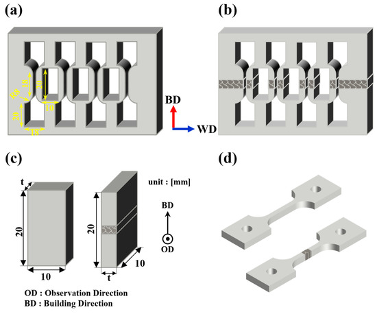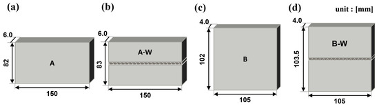 For TIG welding, an experimental optimization approach was employed to determine the optimal welding conditions. Welding trials were conducted under varying parameters, and the resulting welds were analyzed through cross-sectional observation to assess fusion uniformity and porosity. Based on this evaluation, the parameters that produced the most consistent weld quality with minimal defects were selected. The finalized TIG welding conditions included a current range of 72 to 110 A, a voltage range of 12 to 16 V, and an argon shielding gas flow rate of 12 to 17 L/min. The post-welding specimen conditions are illustrated schematically in Figure 2a–d.