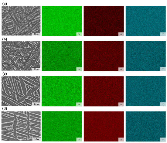 Figure 6 shows the distribution of Ti, Al, and V elements in the deposited and welded materials. SEM images also reveal a difference in the width of the lath α phase between the deposited and welded materials, which can be attributed to the rapid cooling characteristic of the WLAM process. This rapid cooling limits the diffusion and partitioning of alloying elements, leading to a uniform elemental distribution, as confirmed by the energy dispersive X-ray spectroscopy (EDS) measurement results. No feasible chemical heterogeneity was observed in any sample in this study, indicating that the rapid cooling in the WLAM process promotes a homogeneous distribution of Ti, Al, and V elements.