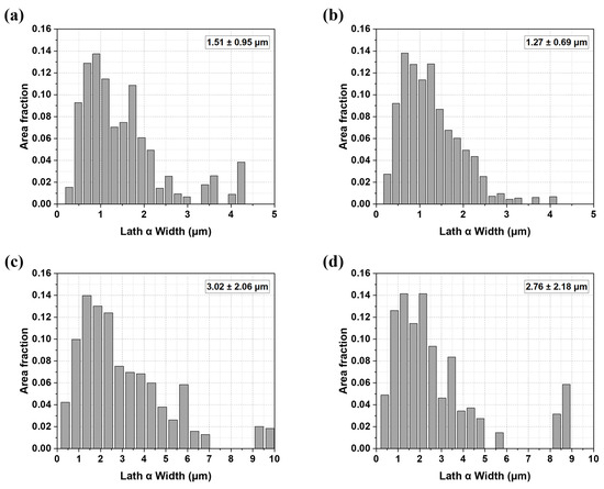 Figure 7 illustrates the width and average value of the lath α phase measured for each specimen. As shown in Figure 7a–d, the average width of the lath α phase varies among the deposit and welded materials: the average widths for the A, B, A-W, and B-W specimens are 1.50 ± 0.95 μm, 1.27 ± 0.69 μm, 3.02 ± 2.06 μm, and 2.76 ± 2.18 μm, respectively.