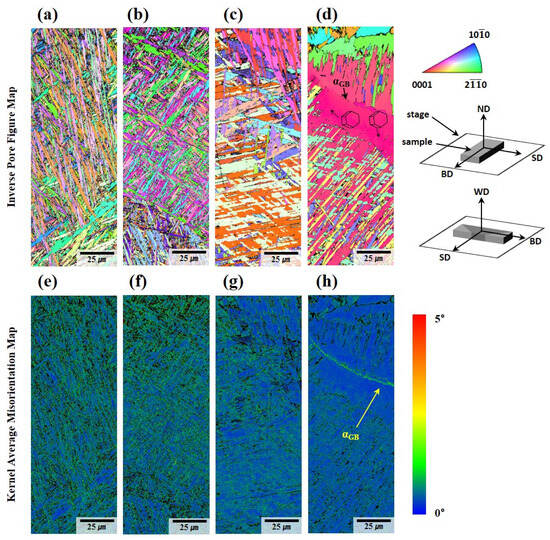 In Figure 8d,h, a continuous colony structure with a strong crystallographic texture is prominently observed along the prior β grain boundary. The average width of the acicular α within these colonies is measured to be 1.2 ± 0.26 μm, indicating a fine yet distinct microstructural morphology. These α colonies are believed to nucleate heterogeneously at the prior β grain boundary, where the localized thermal gradients and compositional variations provide favorable conditions for phase transformation. As these colonies grow, their progression halts upon encountering the adjacent basket-weave structure, creating a well-defined microstructural interface. This interaction between the colony α and the basket-weave microstructure underscores the influence of growth kinetics and competing morphological stability on the resultant grain boundary structures.