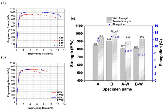 Results of room-temperature tensile tests: (a) stress–strain curves of deposits A and B, (b) stress–strain curves of welded materials A-W and B-W, (c) comparison of tensile properties for deposit and welded materials.