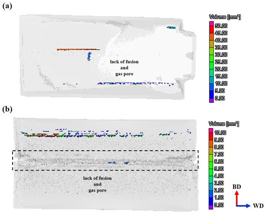 This observation is further substantiated by X-ray CT analysis, as illustrated in Figure 11. Figure 11a displays CT results for specimen A following the WLAM process. The scan reveals internal defects consistent with a lack of fusion, extending along the scan direction, alongside gas pores. These defects are quantified, with an average defect volume of 3.57 ± 7.41 mm3, corroborating the SEM findings from Figure 10a. In Figure 11b, CT analysis of specimen A-W (post-WLAM and TIG welding) reveals the presence of defects not only in the base material (deposits) but also in the FZ. Within the FZ, larger porosities were identified with volumes of 1.32 mm3, 1.6 mm3, and 1.91 mm3, alongside smaller porosities with an average volume of 0.04 ± 0.03 mm3. These porosities are distributed throughout the FZ and are indicative of the challenges inherent in the deposition and welding processes. The presence of these defects acts as localized stress concentration points during mechanical deformation, which, depending on their volume and distribution fraction, lead to a marked reduction in the material’s overall mechanical performance [44,45].