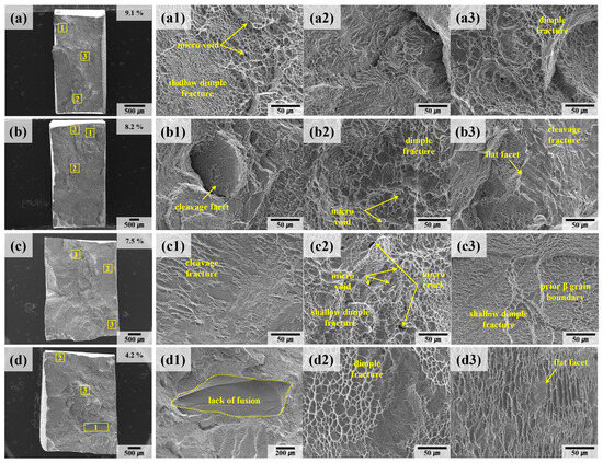 SEM fractography of the deposit specimen after tensile testing: (a) A #1, (b) A #2, (c) B #1, (d) B #2. The numbers 1, 2, and 3 represent the regions indicated by yellow rectangular boxes in the low-magnification images.