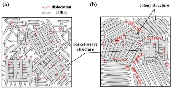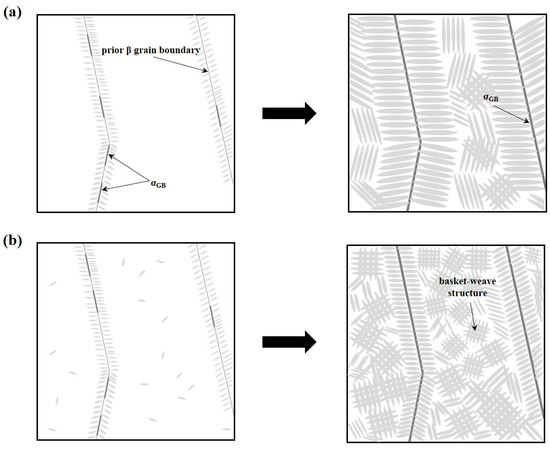 During the cooling process, α nuclei preferentially form near the prior β grain boundaries, giving rise to grain boundary α (αGB) when the material cools below the β-transus temperature (Tβ). Under relatively slow cooling conditions, as illustrated in Figure 13a, the driving force for α nucleation within the grain is diminished. Consequently, coarse α colony structures form through nucleation near αGB or defects where α phases grow in a parallel orientation (see Figure 8d,h). Conversely, rapid cooling, as shown in Figure 13b, enhances the driving force for nucleation, leading to the simultaneous formation of multiple α phases. These phases nucleate not only at the grain boundaries but also within the grains themselves, subsequently growing into plate-shaped lath α structures that intersect to form a basket-weave microstructure (see Figure 8a–b) [51,52,53,54,55,56,57].