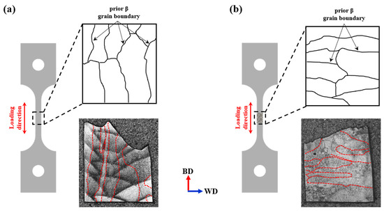 The growth direction of prior β grain boundaries also plays a critical role in determining ductility, as highlighted in the study by B. E. Carroll et al. [62]. The prior β grain boundary typically grows in the direction of the steepest temperature gradient. In deposits, as shown in Figure 15a, the grain boundaries align parallel to the building direction, which coincides with the loading direction during tensile testing. This parallel alignment facilitates dislocation movement along the loading axis, allowing for greater plastic deformation.