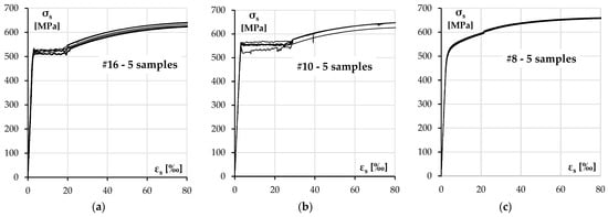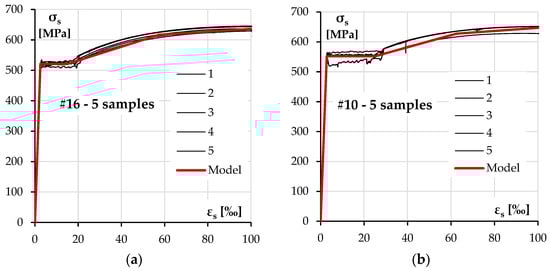 There were three diameters of ribbed bars used in the columns—#10 and #16 mm bars for longitudinal reinforcement and #8 for transverse reinforcement. The nominal yield strength in each case was declared to be 500 MPa. The test results for each size of the reinforcement are presented in Figure 4 and Table 4.