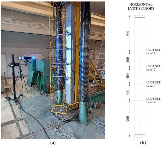 A steel truss was attached to the front of the stand, which allowed for the placement of LVDTs (linear variable differential transducers) for measuring horizontal displacement. The sensors were installed at four levels (see Figure 5b). The configuration of the sensors at each level is presented in Figure 6.