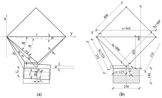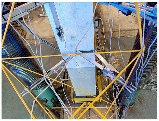 During the test procedure, it was planned to measure the displacement of the element in the horizontal plane in both the x and y directions, as well as the rotation of the cross-section. The first direction was parallel to the force eccentricity, and the second allowed for the control of possible movements in the secondary direction. The displacement measuring system is depicted in Figure 8a,b (also see Figure 6).