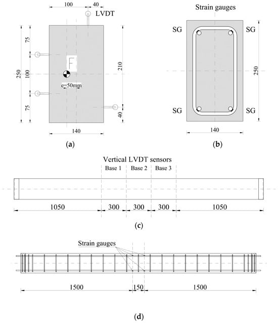 LVDTs were also installed to measure vertical strain on three sides of the column at the central part of the element. Three sensors were used in a line. The base length was 300 mm. The location of the vertical transducers is presented in Figure 7a,c. Figure 7a also shows the location of the force in the section with its eccentricity.