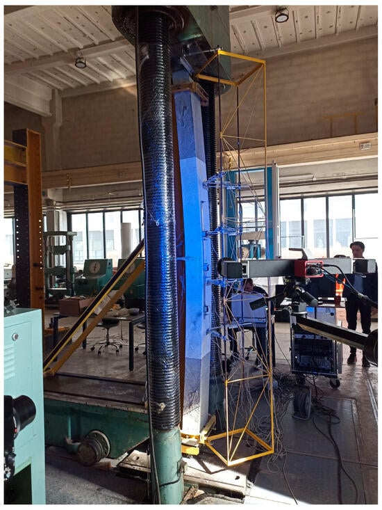 In addition to traditional measuring equipment, an Aramis 3D Camera System was used to capture displacement on the front surface of the columns during the whole procedure (see Figure 5a).