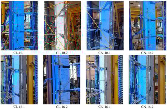 During the conducted tests, columns CL-10-1 and CN-10-1 were tested first; then, due to the deformation of the head plate, it was repaired. This step was justified, but it appeared to have caused an unintended eccentricity in the following columns, as shown in Figure 19 and Figure 20. This effect is also evident in the difference that appeared in the results between the twin columns in Figure 19a,b.