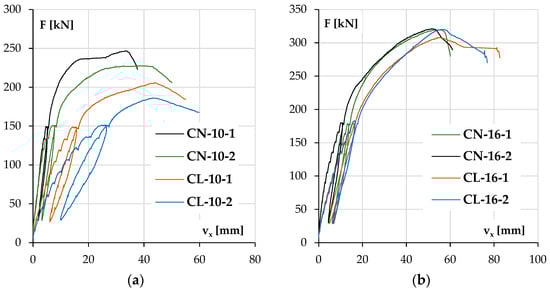 In both groups of columns, it can be noticed that the load bearing capacity was higher for NWAC elements than LWAC elements despite the similar compressive strengths of concrete. This tendency was more significant in columns with lower reinforcement ratios where concrete carried a relatively more substantial part of the total load. The displacement vx increase during loading was also higher for elements made of LWAC with less longitudinal reinforcement (44 mm at maximum force for LWAC and 34 and 39 mm for NWAC elements), which is a result of the lower value of the modulus of elasticity for this kind of concrete. In stronger elements (Figure 11b), the displacement vx at the maximum force was similar for both concrete types, about 55 mm. However, during loading, LWAC columns showed slightly lower stiffness.