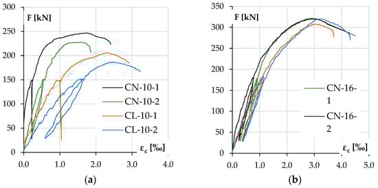 Experimental concrete compressive strain εc as a function of load F for the columns with the following: lower reinforcement ratios (a) and higher reinforcement ratios (b).