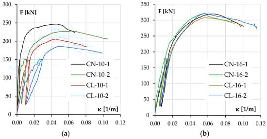 The concrete compressive strain εc–load F responses for the tested columns are shown in Figure 12, and the curvature development during loading is shown in Figure 13. It should be noted that the curvature was calculated from the vertical LVDT sensor readings, while deflection was calculated from the horizontal ones, and the results are consistent.