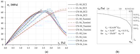 The material models for concrete under compression for each element type analyzed in the research created based on the above formulas and used in the calculations are shown in Figure 16a. After analyzing the deformation results of the tests, the value of in the analyzed models was limited to 4‰, which covers the range of deformations obtained in the tests. This value could not even be achieved in some cases, as the model assumed lower limitations (EC2—black lines).