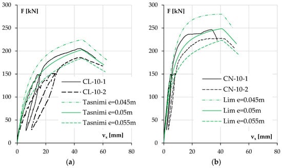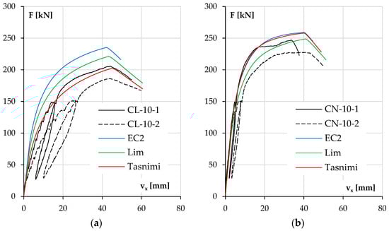 In both low-reinforcement columns (Figure 17a,b), the experimental results are affected by the aforementioned additional unintended eccentricity in the second series of columns, so the following conclusions will apply to the columns of the first series (CL-10-1, CN-10-1). The consequences of measurement difficulties are discussed more fully in the next point. As mentioned above, the behavior of the CL-10-1 column is best approximated by calculations using the Tasnimi 2004 model and the CN-10-1 column with the Lim 2014 model. For the LWAC element, both the load bearing capacity and the deflection at the maximum force are very close (differences of 2% and 4%, respectively). The other two models in this case, due to the much higher value of the elastic modulus, had the effects of underestimating the displacement at each load level and thus the second-order effects, which resulted in the overestimation of the load carrying capacity. In the case of the CN-10-1 column, the load bearing capacity was found to be most accurately estimated using the Lim 2014 model; the difference in the value of maximum forces was 5%. This model also allowed for the most accurate estimation of the elastic modulus of concrete (see Table 3 and Table 8). A representative comparison of deflections is impossible due to the appearance of displacement in the secondary direction above a force of 230 kN (see Table 5).