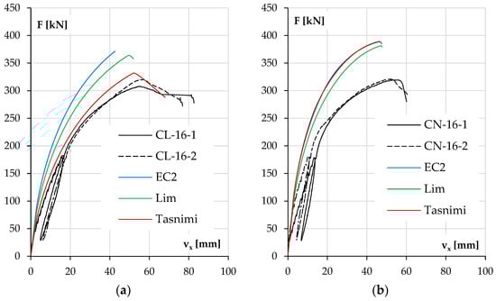 In the case of LWAC columns with higher ratios of reinforcement (Figure 18a), the red line referring to the Tasnimi 2004 model also represents the element’s behavior very well. The calculated load capacity was overestimated by 4% and 8% compared to the experimental values. The theoretical deflection (53 mm) at the maximum force was slightly lower than that obtained in the test (57, 54 mm)—differences of 7% and 2%. The results for the other two models differed analogically from those of the LWAC columns with #10 bars.