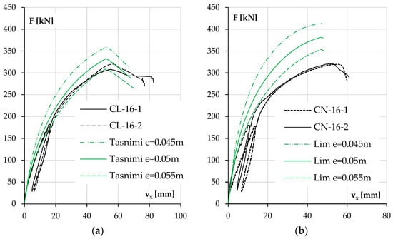 Analyzing the results, it can be seen that the main parameter determining the consistency of the results was, as expected, the elastic modulus of concrete. As mentioned earlier in the case of LWAC, the elastic modulus determined in the tests was the same as the one calculated according to the Tasnimi 2004 model, which is reflected in the curves shown in Figure 17a and Figure 18a. The closest estimate of the elastic modulus for NWAC was obtained from the Lim 2014 model, and it had the lowest calculated value. However, it was still 7% higher than that obtained from testing cylindrical specimens. These results are presented in Figure 17b and Figure 18b.