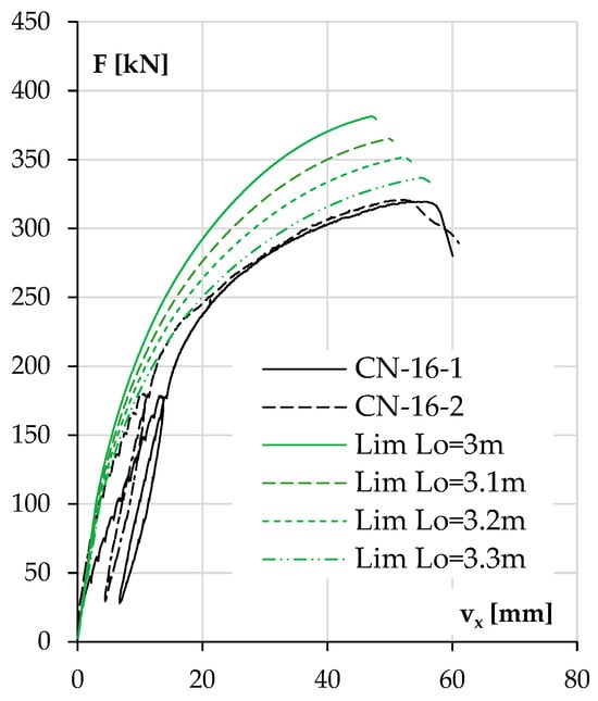 Figure 21 shows the behavior of the columns, with an increasing theoretical buckling length as a result of the deformation of the stand. The calculations used a nominal force eccentricity of 0.05 m and the Lim 2014 model for concrete. It can be seen that a change in buckling length resulted in an increase in theoretical deflection at the maximum force, in contrast to the diagrams shown in Figure 19 and Figure 20, where a change in eccentricity resulted in a change in the maximum force but not in the corresponding deflection. This confirms that the results for the two columns shown in Figure 21 were not only affected by the unintentional eccentricity.