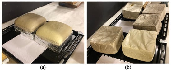 To fabricate the composite rigid polyurethane foam samples, we incorporated appropriate amounts of microspheres (5 wt.%) and fly ash (5, 10, and 15 wt.%) into the polyol components. This was achieved by thoroughly stirring the mixture using a laboratory stirrer at a high speed of 4500 rpm for one minute. The polyol and isocyanate components (weight ratio of 100:110) were then combined using the same stirring method for an additional minute before being poured into rectangular molds measuring 20 × 20 × 5 cm (Figure 1a). The filled molds were subsequently placed under a fume hood to allow the foams to set and cure. After a 48 h period, the foams were demolded and then rested under the fume hood for five more days to ensure the complete removal of any unreacted isocyanate (Figure 1b). A total of four different material types were produced. The resulting composite foams were designated as 5M5FA, 5M10FA, and 5M15FA, while the unmodified rigid polyurethane foam was labeled as PUR.