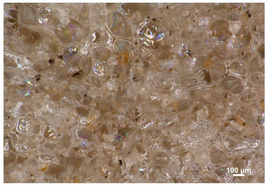 The scanning electron micrographs revealed that the cellular structure of the composite RPUF was well developed (Figure 4). The polymer matrices exhibited uniformity, with the filler particles (microspheres and fly ash) evenly dispersed throughout and no accumulations detected. Since the SEM samples were coated with gold to enhance the image quality, the test results could not be used to quantify the cellular parameters. Instead, these important microstructural characteristics were determined through detailed optical microscopy observations. The inclusion of both microspheres and fly ash in the composite RPUF materials did not significantly impact the overall cellular structure or morphology of the polyurethane foam.