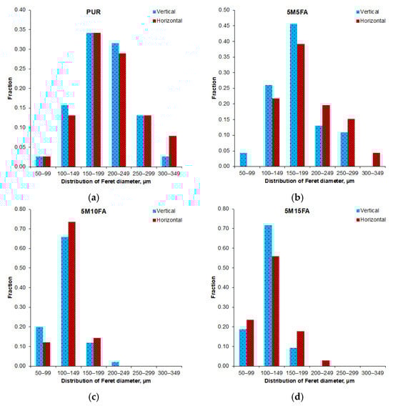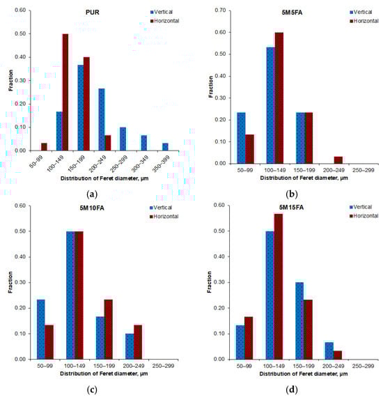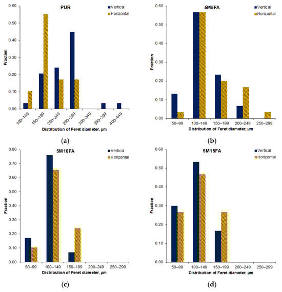 Histograms depicting the Feret diameters for the pristine polyurethane foam (a) and the composite foam groups with varying filler contents (5M5FA (b), 5M10FA (c), and 5M15FA (d)).