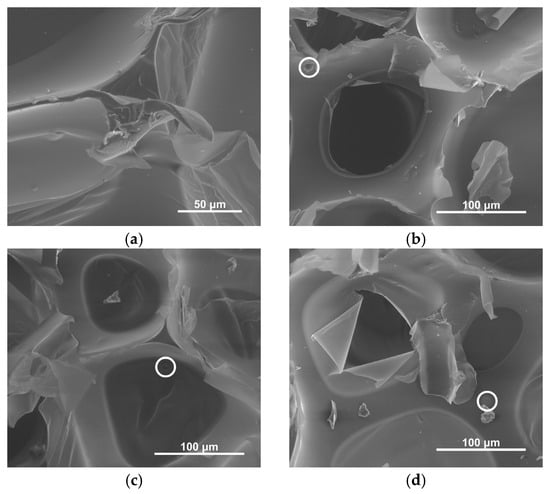 Scanning electron micrographs of PUR (a), 5M5FA (b), 5M10FA (c), 5M15FA, and (d) composite foams. Filler particles were denoted with encircled regions. The magnification used was 1000×.