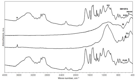 The FTIR spectra of the pristine polyurethane foam (PUR), microspheres (M), fly ash (FA), and polyurethane foam composite containing 5 wt.% M and 15 wt.% FA (5M15FA). Bands indicating the presence of fillers within the polymer matrix in composite 5M15FA were marked with ‘*’, ‘**’, ‘***’, and ‘****’.