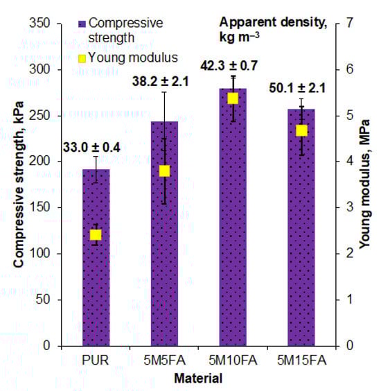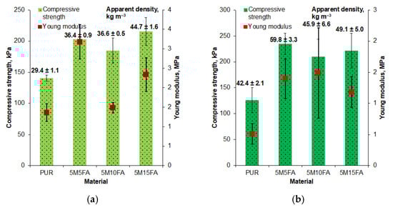 The incorporation of both fillers, up to 15% by weight, led to enhanced compressive strength and Young’s modulus compared to the unmodified polyurethane foam. This suggests potential beneficial interfacial interactions between the polymer matrix and fillers, as well as a uniform distribution of the fillers within the polymer matrix. However, the mechanical properties calculated for the 5M15FA composition were slightly lower than the other composites, indicating the potential overloading of the polymer matrix with filler particles. These findings align with the conclusions drawn in previous related studies [,,].